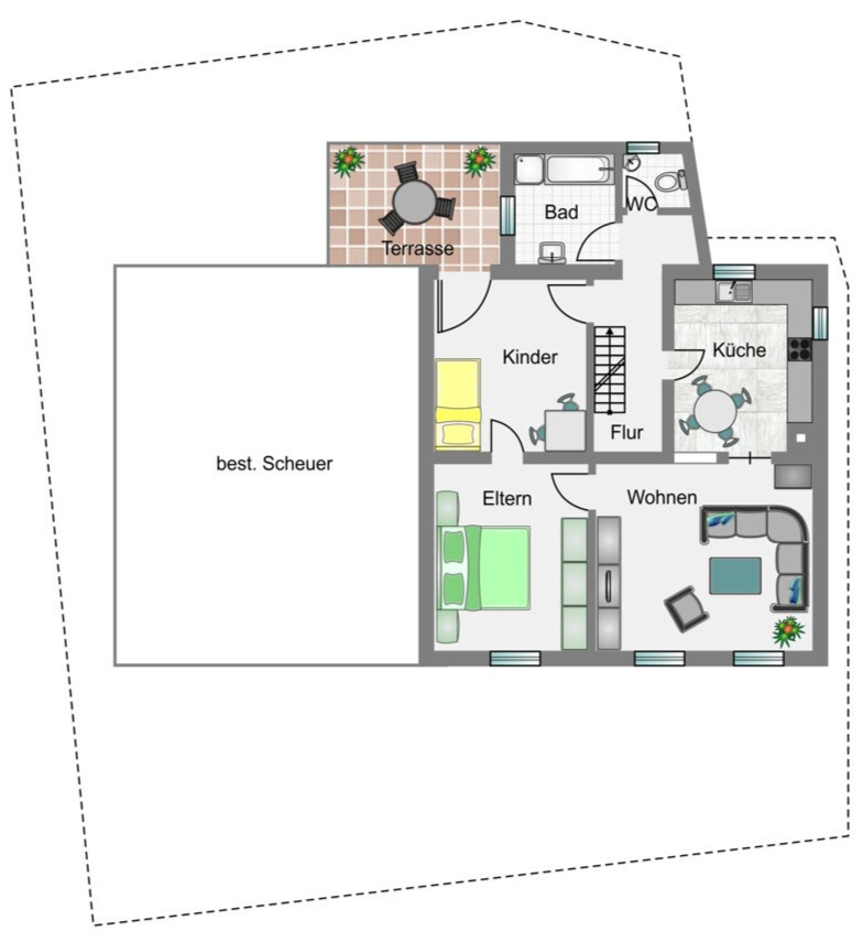 Zusätzlich zur Wohnfläche bietet die Scheune vielseitige Nutzungsmöglichkeiten, sei es als Werkstatt, Atelier, zusätzlicher Stauraum oder zum späteren Ausbau. Hinter der Scheune befindet sich ebenfalls das ehemalige Schwimmbad, ein separater abgeschlossener Raum.