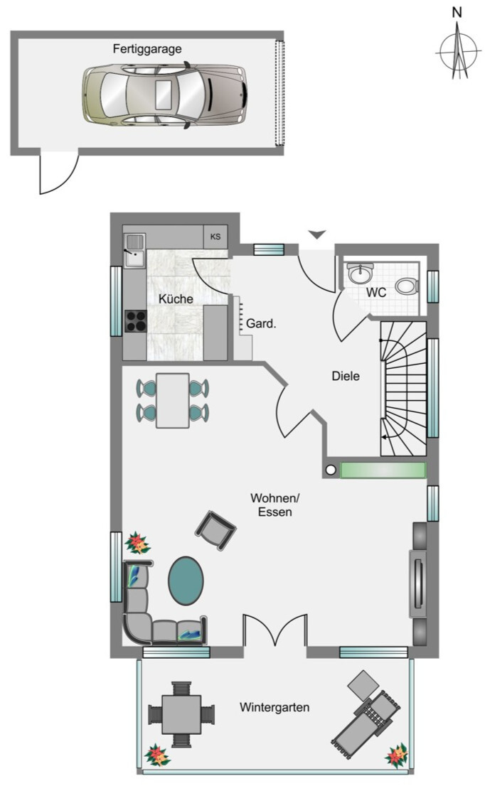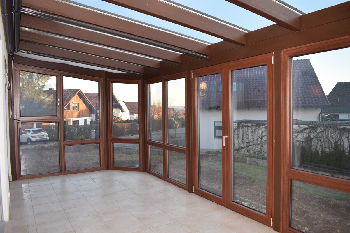 Im Erdgeschoss erwarten Sie eine funktionale Küche, ein Gäste-WC sowie ein großzügiger Wohn- und Essbereich mit direktem Zugang zum Wintergarten. Große Fensterfronten sorgen für ein außergewöhnlich helles und freundliches Wohnambiente. Ein Kachelofen verleiht dem Wohnbereich zusätzliche Wärme und besondere Gemütlichkeit. Der liebevoll angelegte Garten lädt zum Entspannen und zum Genießen lauer Sommerabende ein. Der großzügige Wintergarten bietet ganzjährig Platz für gemütliche Stunden – sowohl im Sommer als auch im Winter.