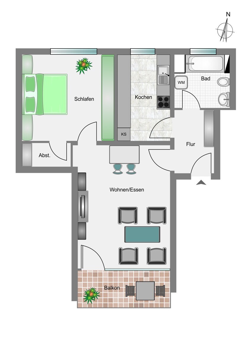 Die Wohnung bietet Ihnen zwei geräumige Zimmer, darunter ein großzügiges Schlafzimmer und ein Wohnzimmer. Die Küche ist mit einer vollständigen Einbauküche ausgestattet. Die Böden sind mit hochwertigem Laminat und stilvollen Fliesen ausgelegt, die zur gemütlichen und einladenden Atmosphäre beitragen. Ein Süd-Balkon verleiht der Wohnung weiteren Freiraum.