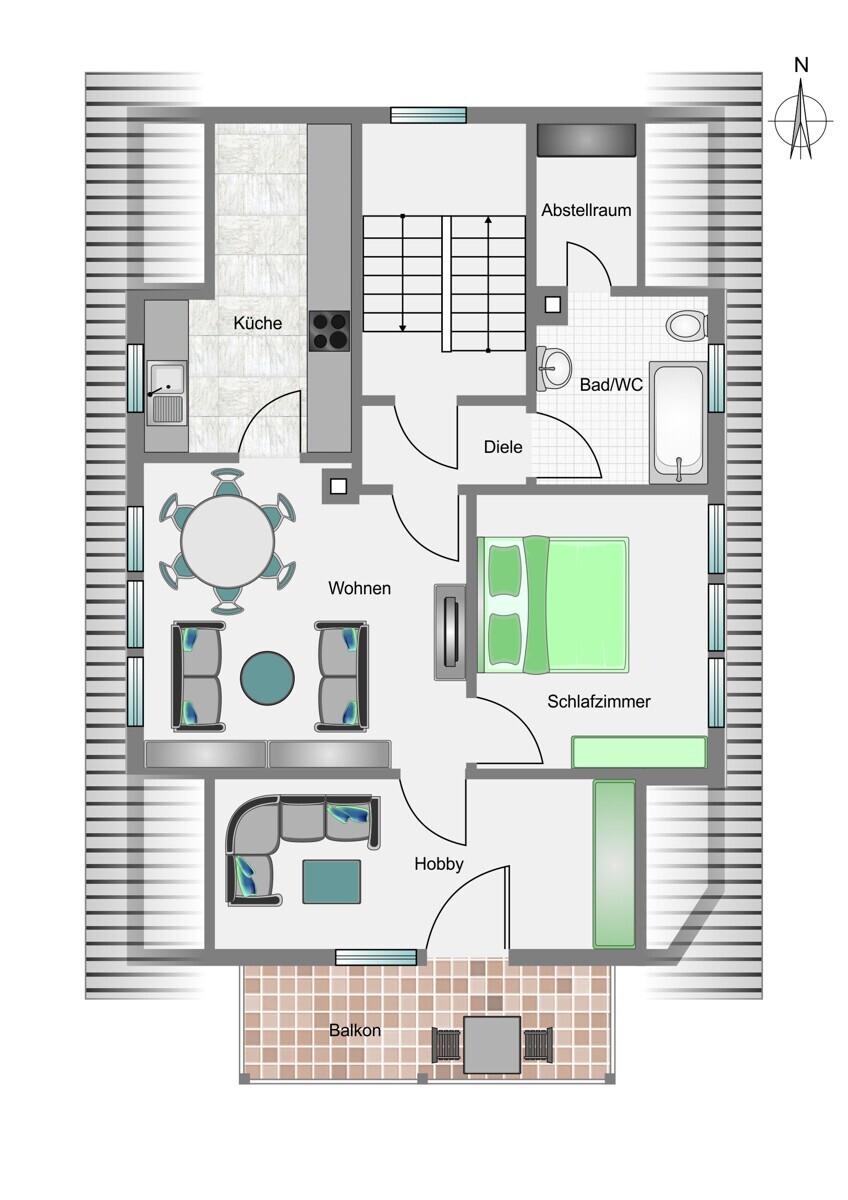 im 1. OG ca. 70m² und im DG ca. 49m² zur Verfügung.