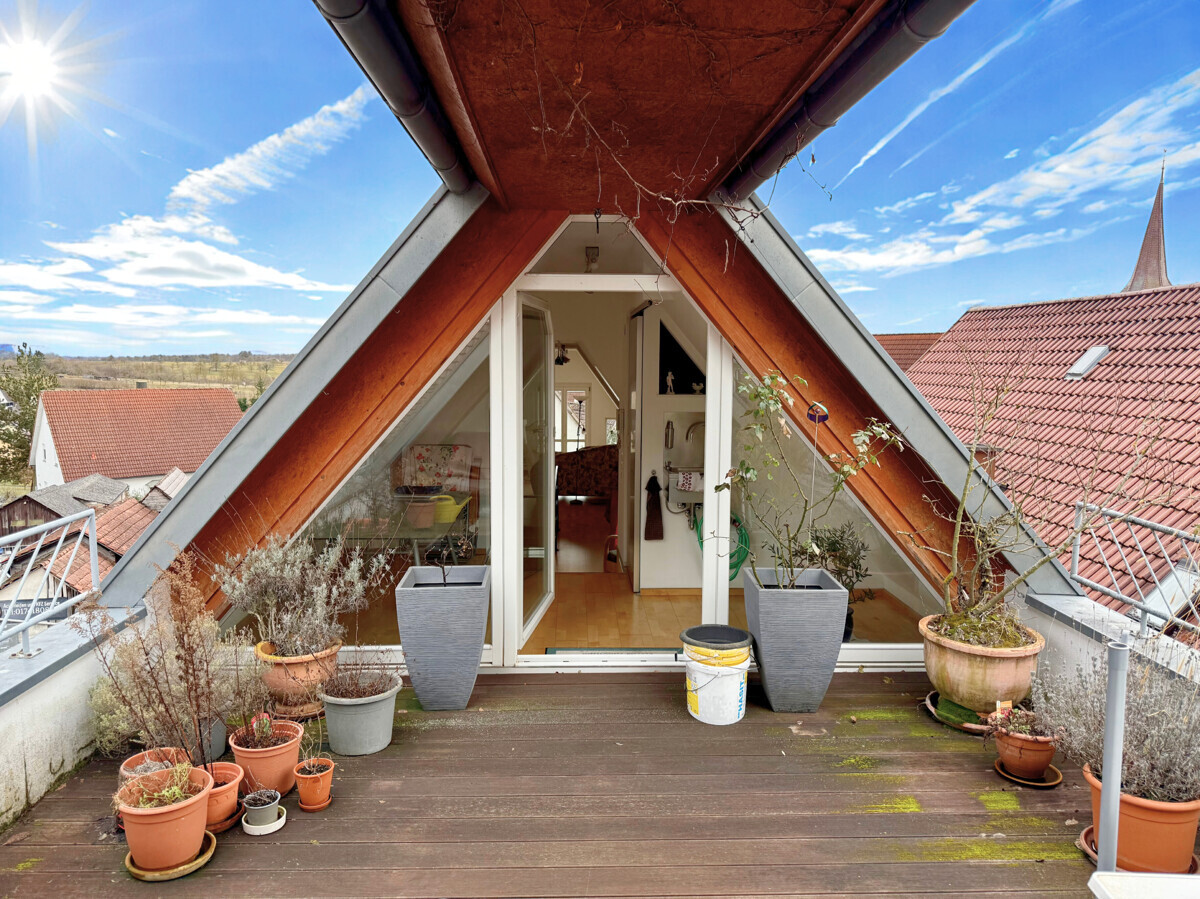 Ein absolutes Highlight dieser Immobilie ist die einzigartige Dachterrasse mit beeindruckendem Weitblick bis zur Schwäbische Alb. Hier genießen Sie sonnige Stunden in besonderer Atmosphäre – ein Ort zum Entspannen und Verweilen.