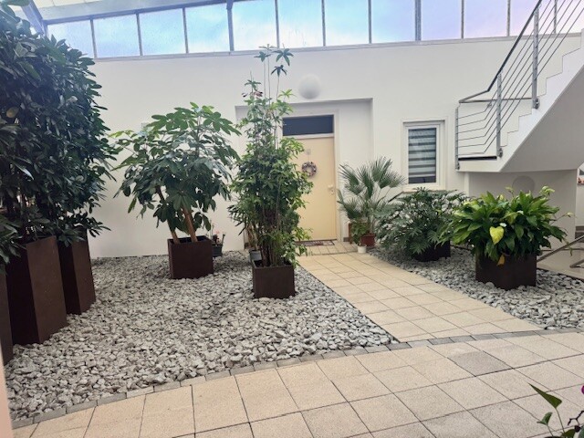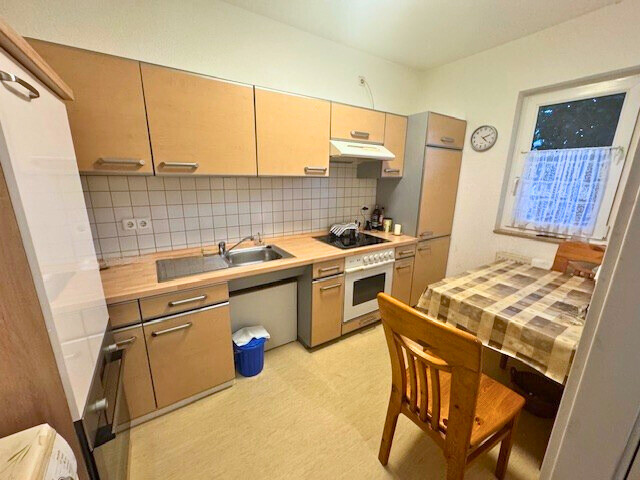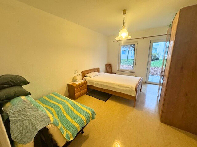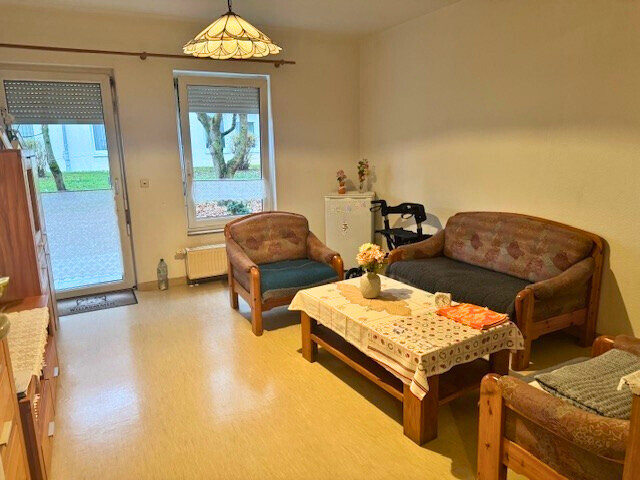 Die Erdgeschosswohnung besteht aus 2 Zimmern (Wohn- und Schlafzimmer), einem barrierefreien Bad, einer gepflegten Einbauküche mit Einbauten sowie einem Abstellraum in der Wohnung. Zusätzlich gehört ein großer Kellerraum im Untergeschoss dazu.