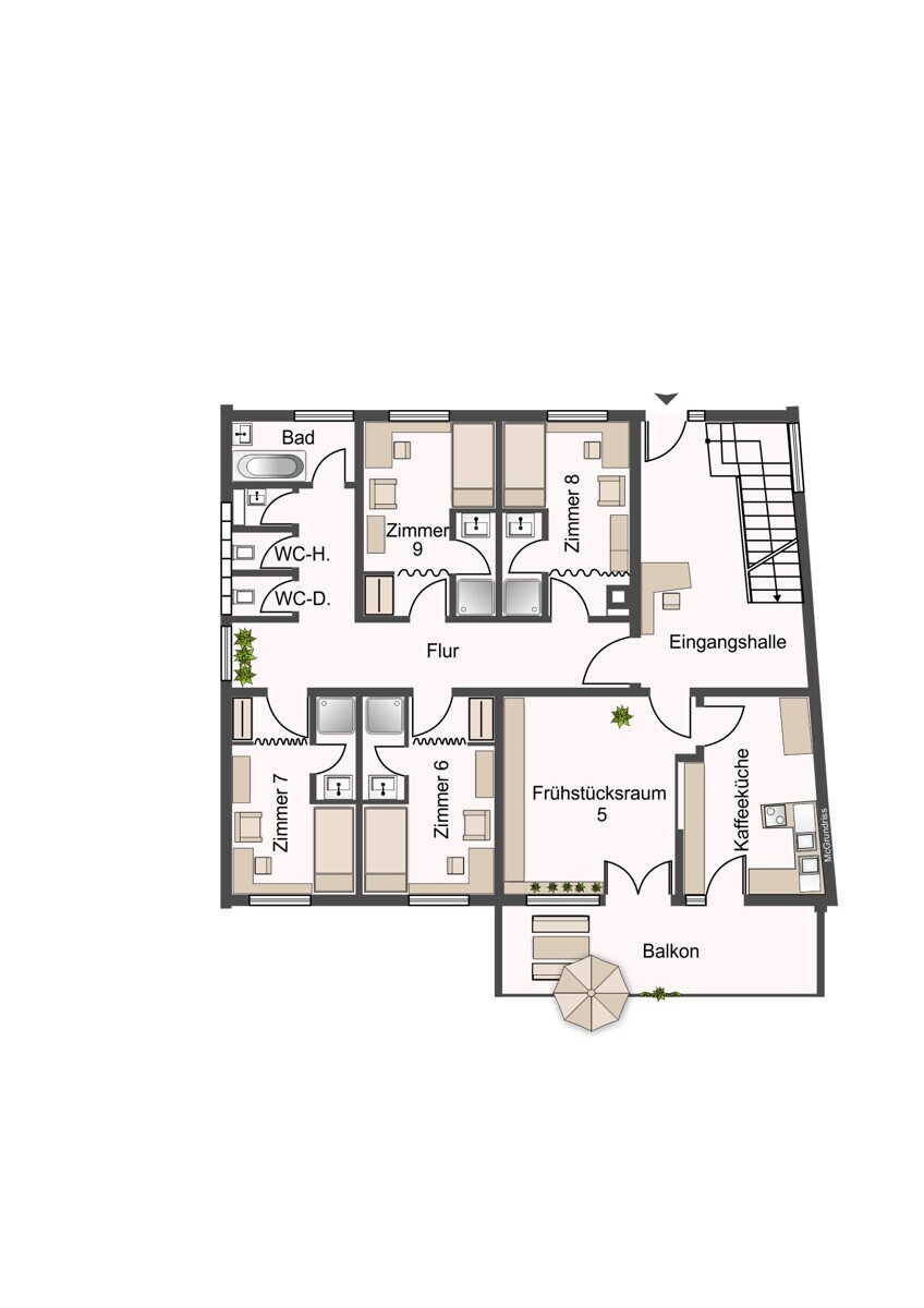 Im Erdgeschoss befindet sich zudem die Kaffeeküche und der Frühstücksraum.